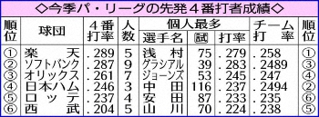特に目立ったのが先発4番の不振だ。今季は山川が最多の70試合で打率・224。以下メヒア・175、栗山・180、外崎・222、中村・091と5人トータルで・204。先発4番のチーム打率としては56年高橋ユニオンズの・198以来64年ぶりの低さ。西武では73年(当時太平洋)の・215を下回る球団ワースト記録の屈辱となった。