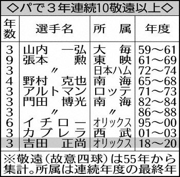 この数字を押し上げたのが敬遠四球。18年から10、12、17個と相手投手の警戒は強まり、3年連続2桁はパで8人目(10度目)。敬遠後の次打者は16打数4安打1四球で、最多の6打席に立ったジョーンズは5打数無安打1四球だった。来季は四球禍にさせないためにも、強力な相棒の出現が望まれる。(記録担当・石丸 泰士)