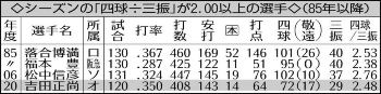 さらに、三振の少なさと四球の多さが際立つ。コロナ禍で120試合制とはいえ、わずか29三振。豪快なフルスイングのイメージからは意外な数字だ。72四球はリーグ5位ながら、四球÷三振は2・48。三振より四球が多いことを示す1・00以上ですら、今季は青木(ヤ)、近藤、西川(ともに日)と4人しかおらず、2・00以上になると、平成以降では06年松中信彦(ソ=2・76)だけという異次元のレベルだ。