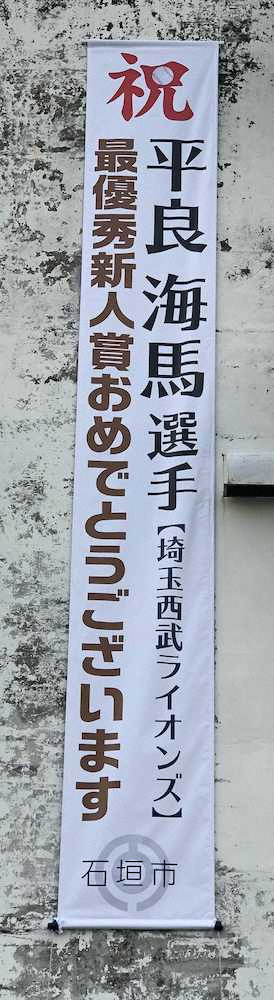 沖縄県出身者初の新人王を受賞した西武の160キロ右腕・平良の地元、石垣市の市役所が21歳右腕に粋な「クリスマスプレゼント」を贈った。同市庁舎外壁に「祝・最優秀新人賞」の懸垂幕が登場。市関係者は「23日から掲げました。(石垣島の)島民もみんな喜んでいます」と話した。