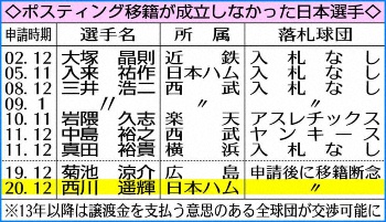 ≪「実現せず」9例目≫日本選手がポスティングシステムでメジャー移籍が実現しなかったケースは、過去に8例(7人)。西川は9例目となる。19年オフには広島・菊池涼介が同様に米球団との交渉がまとまらず、20年1月3日の期限を待たずに12月27日、残留を表明した。02年オフに入札球団がなかった大塚晶則(現・晶文)は、翌03年オフにパドレスへポスティングで移籍。岩隈久志、中島裕之(現・宏之=巨人)は入札球団との交渉が合意に至らず、1年後、海外FA権を行使して移籍を果たした。