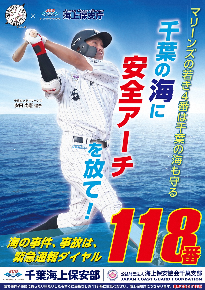 ロッテ・安田が千葉海上保安部のポスターに起用される。海上保安庁は海難事故などの通報先として、00年から緊急通報用電話番号「118番」の運用を開始。同番号の周知を強化し、海の安全・安心を確保するための「顔」を務める。県内の公共交通機関、公共施設などに順次、約2000枚が掲出される。