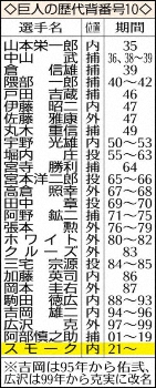背番号は「10」を予定。外国人選手では80~82年のロイ・ホワイト、83年のヘクター・クルーズ以来3人目となる。406本塁打を放った阿部2軍監督が現役を引退するまで19年間背負い、空き番となっていた。期待の高さを物語る番号だ。