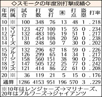 スモークは、マリナーズ時代にはイチロー、岩隈、川崎と同僚。15年にブルージェイズで川崎と再び同僚となった。12年にはマ軍の一員としてアスレチックスとの日本開幕戦(東京ドーム)で来日し、第2戦で本塁打。日本選手、日本と縁の深い選手でもある。動画の最後には「待っていてください!」と日本のファンにメッセージを送って締めくくった。(神田 佑)