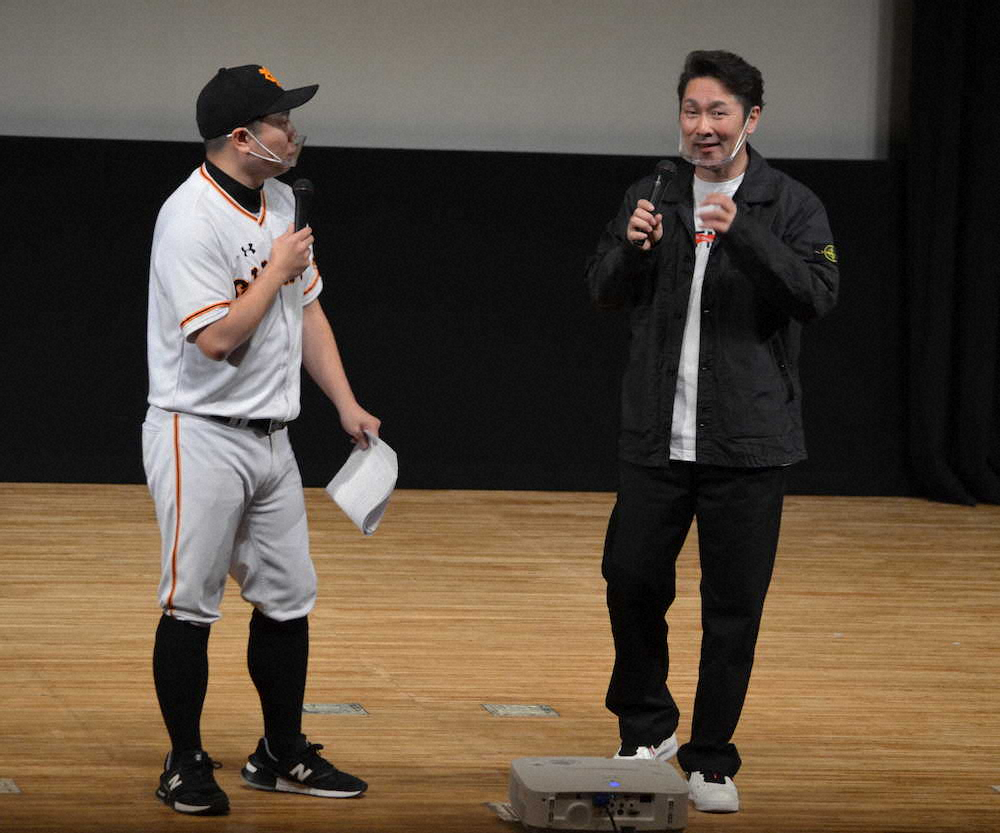 大阪府内でトークショーに出演した巨人・元木ヘッドコーチ(右)と司会を務めたものまね芸人・あれ慎之助