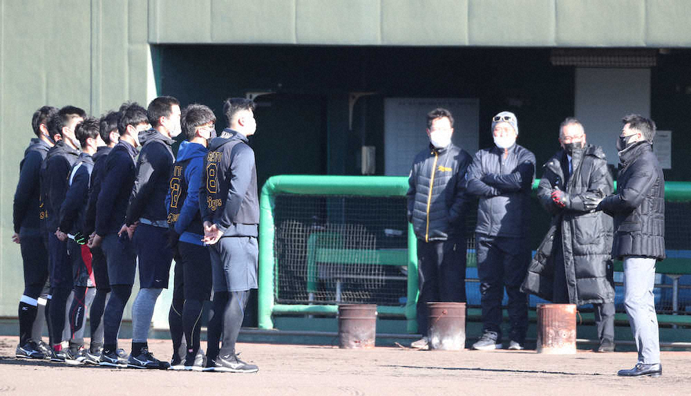 <阪神 新人合同練習> 新人選手に訓示する矢野監督(右)(代表撮影)