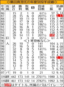 ◆桑田 真澄(くわた・ますみ)1968年(昭43)4月1日生まれ、大阪府出身の52歳。PL学園では5季連続で甲子園に出場し優勝2度、準優勝2度。甲子園通算20勝は戦後最多。85年ドラフト1位で巨人入団。2年目の87年に防御率1位、ベストナイン、沢村賞を受賞し、94年にMVPを獲得した。95年に右肘じん帯を断裂。じん帯移植手術を受け、97年に復帰した。ゴールデングラブ賞8度。06年限りで巨人を退団しパイレーツに入団。08年3月に引退した。09年には早大大学院に入学。右投げ右打ち。