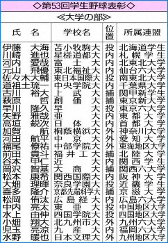 大学では楽天1位の早大・早川隆久投手、日本ハム1位の苫小牧駒大・伊藤大海投手、巨人7位の創価大・萩原哲捕手らが選出された。