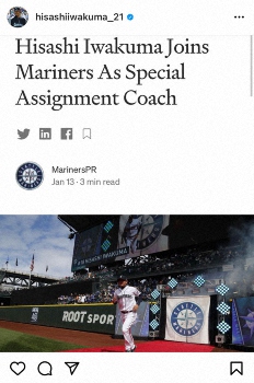 岩隈氏は「この度シアトルマリナーズの特任コーチに就任しました」と報告。「昨年末にオファーを頂き、感謝すると共に光栄に思い、有難くお受けする運びとなりました」と経緯を説明した。