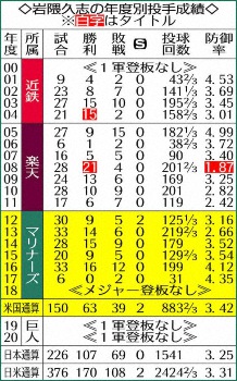 ◆岩隈 久志(いわくま・ひさし)1981年(昭56)4月12日生まれ、東京都出身の39歳。堀越から99年ドラフト5位で近鉄入団。04年に15勝で最多勝。05年から創設1年目の楽天に所属し、08年に21勝4敗、防御率1.87。最多勝、最優秀防御率、最高勝率に加え、パ・リーグMVP、沢村賞に輝いた。12年に海外FA権を行使してマリナーズ移籍。15年には日本人大リーガーでは2人目のノーヒットノーランを達成した。19年に巨人に移籍して日本球界に復帰し、20年限りで現役を引退。日米通算376試合に登板し170勝108敗2セーブ、防御率3.31。右投げ右打ち。