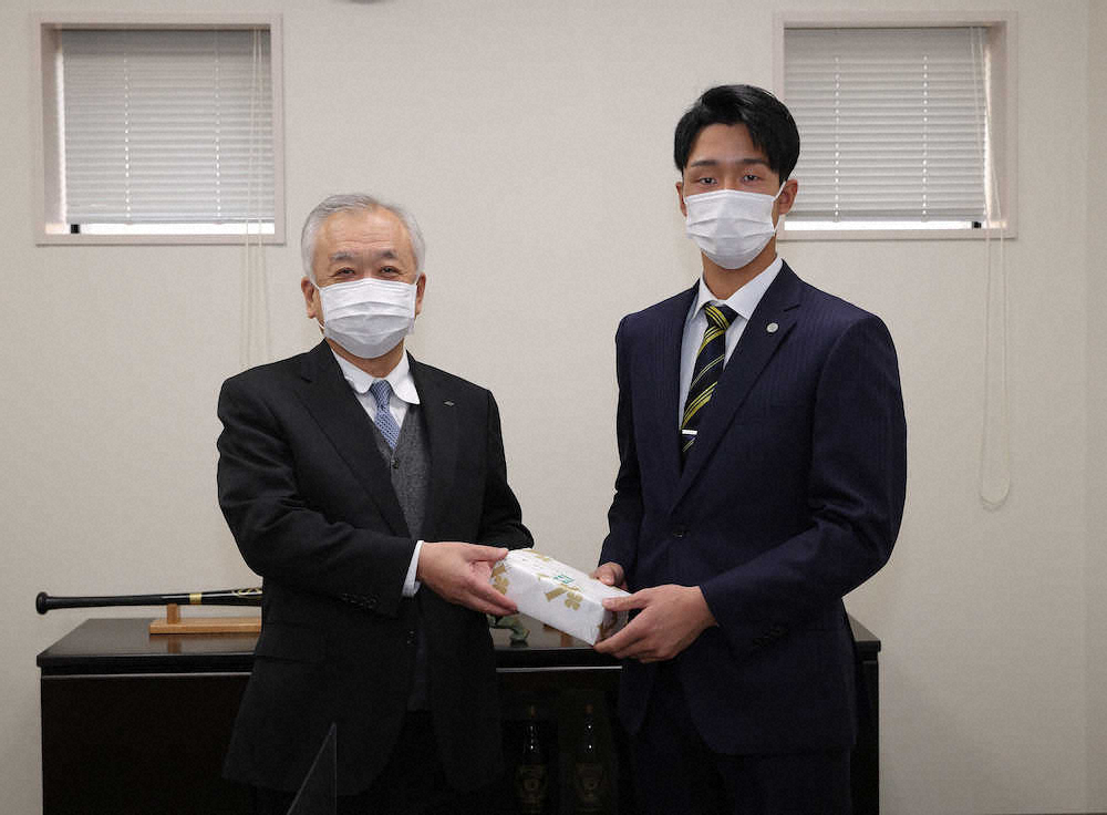 今年新成人の仲間入りとなった阪神・小幡竜平内野手(20)と川原陸投手(20)が14日、球団事務所で藤原崇起オーナー兼球団社長(68)から祝福の記念品を受け取った。