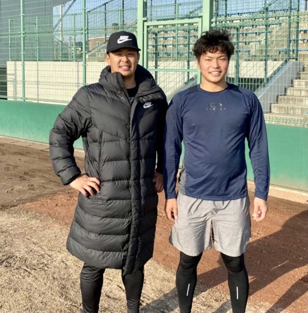 浅村(左)の自主トレに弟子入りした石垣は2桁本塁打を決意(石垣本人提供)