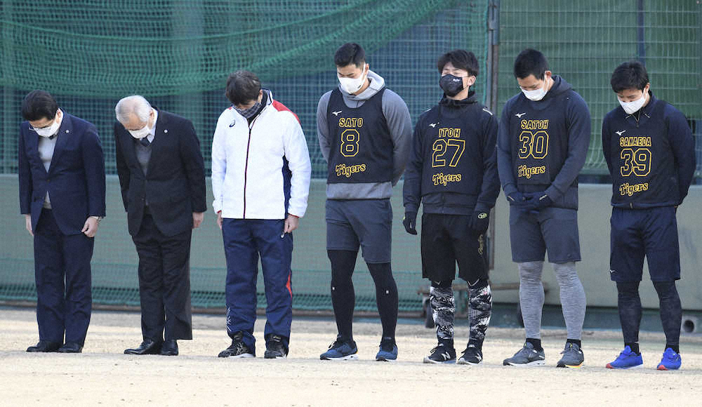 阪神大震災の犠牲者らに黙とうをささげる(左から)谷本球団本部長、藤原オーナー兼球団社長、平田2軍監督、佐藤輝、伊藤将、佐藤蓮、栄枝