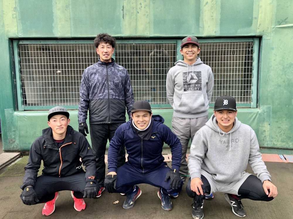 京都府内で自主トレを行う(後列左から)藤田、福山、(前例左から)小深田、山崎剛、黒川(球団提供)