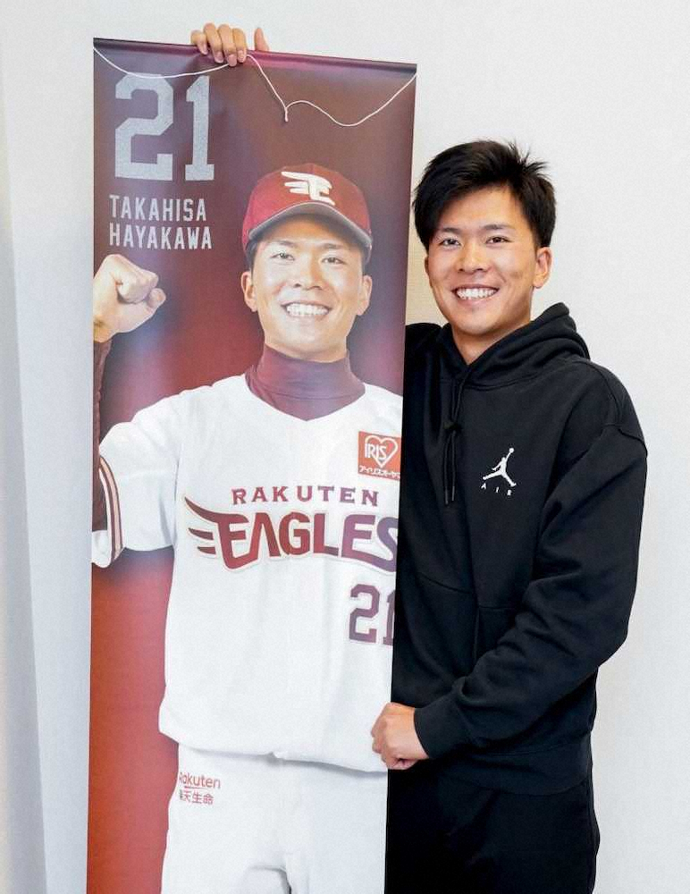 楽天が新人限定グッズ「ほぼ等身大タペストリー」を販売へ ドラ1早川は「お部屋で会いましょう」