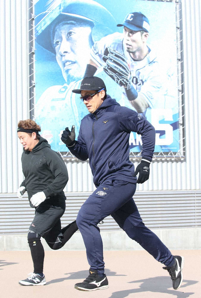 室内練習場横のスロープを岡田雅利(左)と駆け上がる栗山巧(撮影・森沢裕)