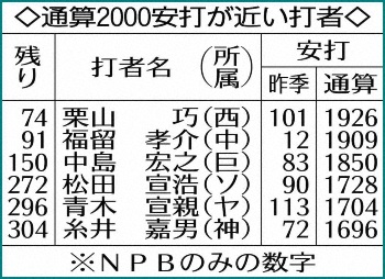 ≪通算2000試合も間近≫栗山(西)は通算2000安打にあと74本。西武での通算安打5傑は(1)栗山巧1926(2)石毛宏典1806(3)伊東勤1738(4)中村剛也1522(5)高倉照幸1446。栗山が達成すれば、球団史上初めてになる。また、通算出場は1958試合。西武で通算2000試合以上は伊東勤の2379試合があるだけ。栗山がチーム2人目の到達となりそうだ。