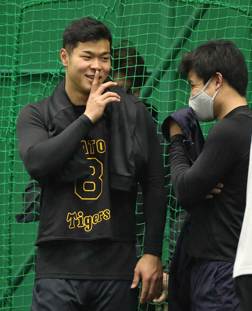 <阪神新人合同自主トレ>栄枝(右)と談笑する佐藤輝