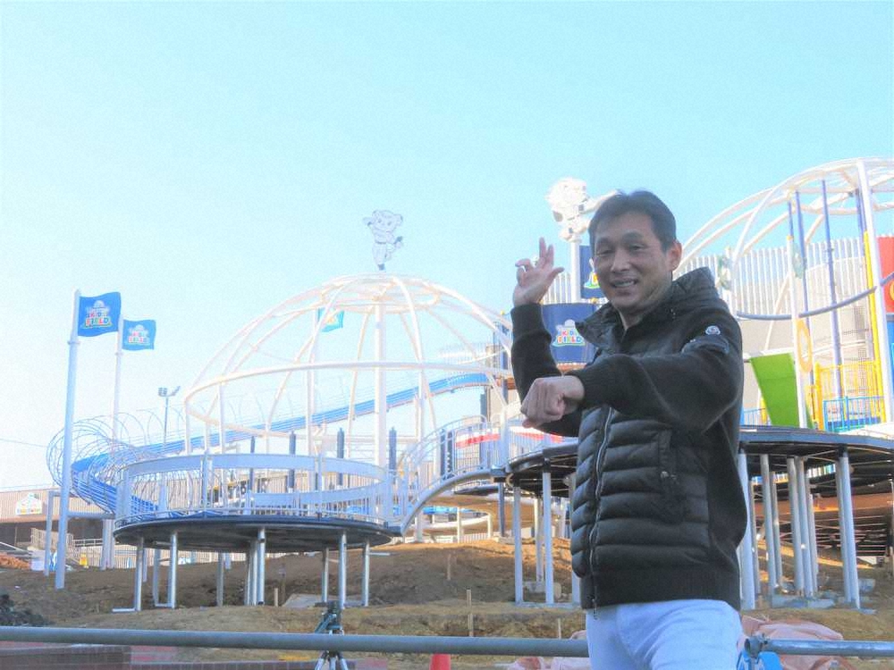 高さ5.5メートルから左に急転換しながら曲がる迫力満点の遊具。現役時に切れのあるスライダーを武器とした同コーチは「これ、俺のスライダーより全然曲がるやん。こんなに高いところからボールパーク全体を見渡しながら滑り降りるのは気持ちいいでしょ」と笑顔を見せた。