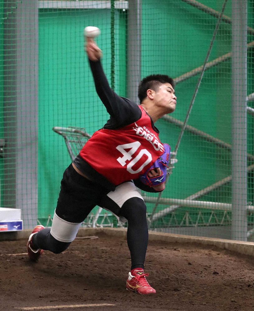 楽天の新人合同自主トレで投球練習をする内間(撮影・白鳥 佳樹)