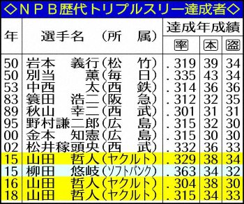 ヤクルトの山田哲人内野手(28)が27日、18年以来となるトリプルスリー達成を誓った。このオフは国内フリーエージェント(FA)権を行使せず、日本球界最長タイの7年契約を結び残留し新主将にも就任。すでにプロ野球記録となる3度のトリプルスリーを達成。4度目なら、バリー・ボンズのメジャー記録を抜いて“世界新”となる。