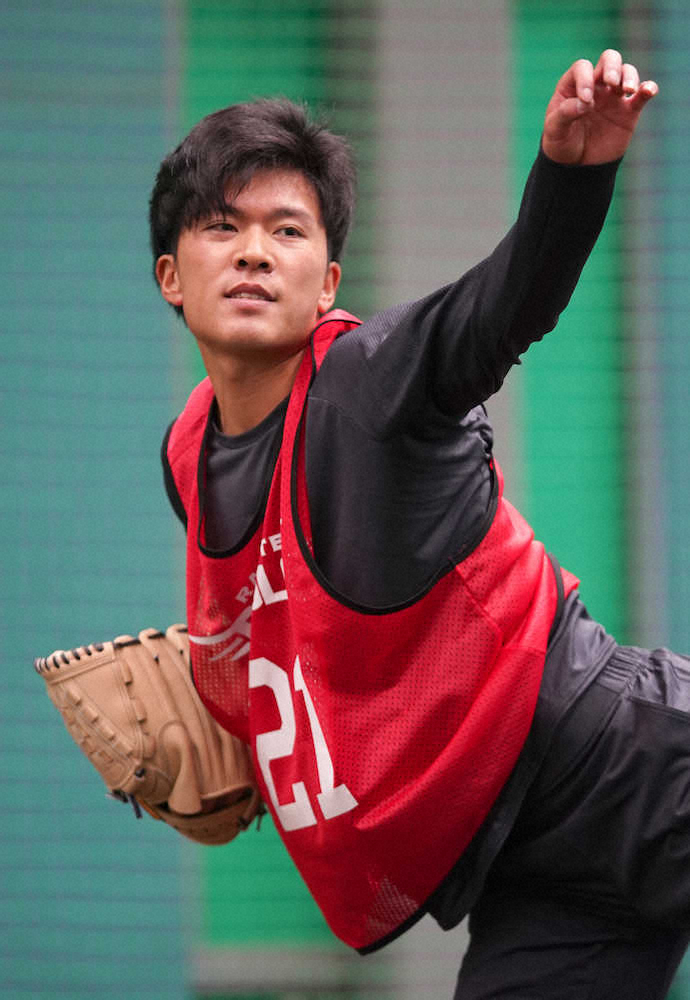 新人合同自主トレでは2度目のブルペン入り。初めて捕手を座らせて12球、計37球を投げた。「キャンプ前で自分の状態を把握したかった」。イメージは「釣り竿のような左腕のしなり」で、そのための下半身の使い方、腰の回転などをチェック。計750球に設定していた春季キャンプでの投球数も「750球から900球ぐらい」と修正した。28日に合同自主トレを打ち上げる。
