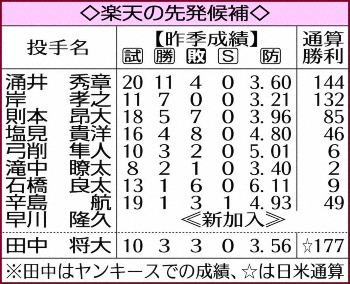 昨年、ロッテから移籍した涌井は11勝で最多勝を獲得。岸は腰の違和感で出遅れたが、無傷の7勝を挙げた。則本昂は2年連続の5勝から復活を目指す。通算勝利数では田中が日米通算177勝、涌井が144勝、岸132勝。通算100勝以上が3投手は12球団最多で、2人以上も巨人(大竹102勝、菅野101勝)、西武(松坂日米通算170勝、内海134勝)の2球団だけ。楽天は85勝の則本昂を加えた4投手で、通算538勝に達する。