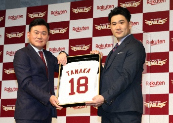ヤンキースからFAとなり、2013年以来8年ぶりに楽天への復帰が決まった田中将大投手(32)が30日、都内のホテルで会見した。会見には三木谷浩史オーナー(55)が同席する異例の待遇。立花陽三球団社長(50)、石井一久GM兼監督(47)も顔をそろえ、豪華な布陣での会見となった。