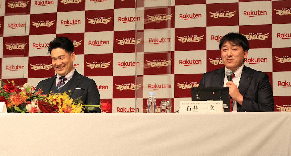 楽天入団会見で、石井GM兼監督と笑顔でやり取りする田中将(左)(撮影・篠原岳夫)