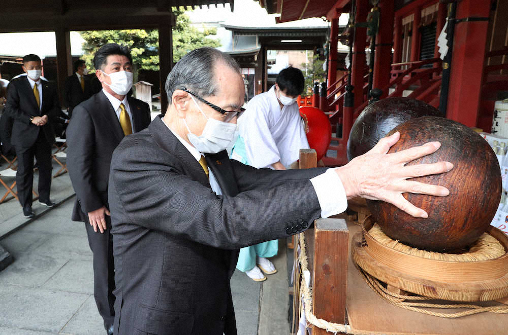勝負の神様で有名な筥崎宮での必勝祈願。キャンプイン前の恒例行事はコロナ下で非公開となり、選手も中村晃選手会長ら4人だけとなった。静かな境内で祈りをささげる中で、王会長は闘争心を燃やしていた。天敵の田中将に対してだ。