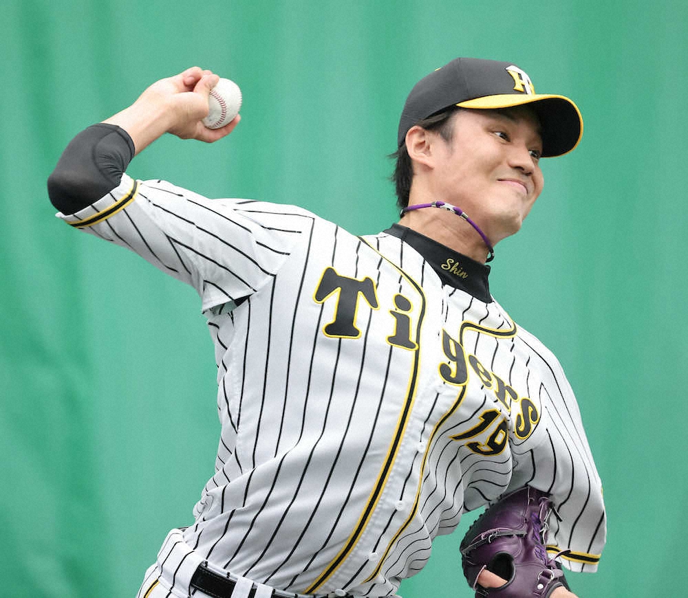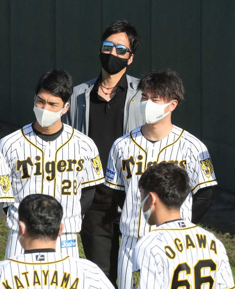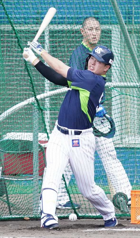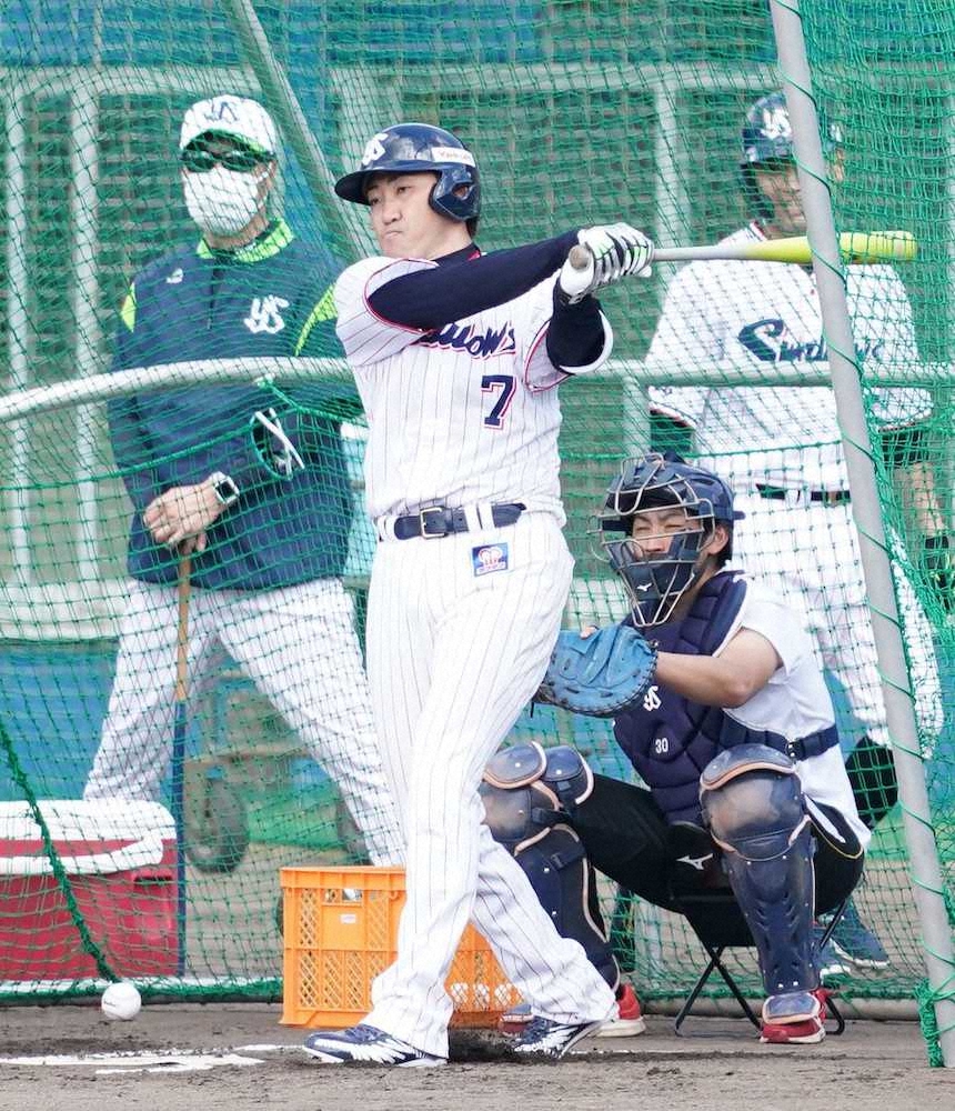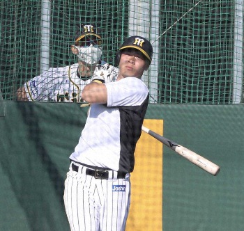 <阪神キャンプ>矢野監督の前でフリー打撃を行う佐藤輝(撮影・大森 寛明)=1日、沖縄・宜野座