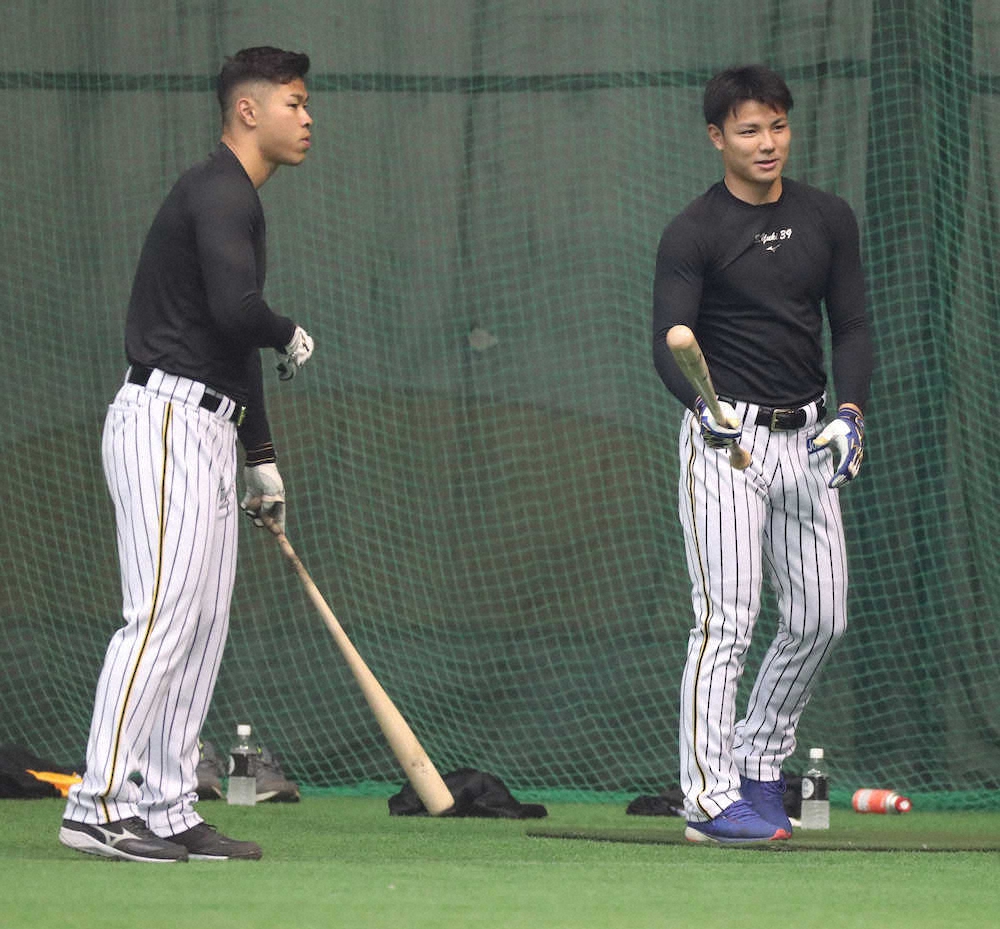 沖縄・宜野座でキャンプインの阪神は、早速若手選手らが早出練習を敢行。ドラフト1位の佐藤輝明内野手(21=近大)、同4位の栄枝裕貴捕手(21=立命大)らに加えて近本、小幡、坂本、秋山、小川らが室内でティー打撃やストレッチなどで体を動かしている。