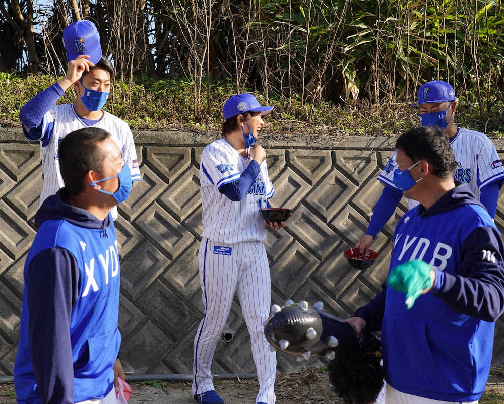 ドッキリ大成功!DeNAの三嶋、伊勢、新人の入江が練習前に鬼のマスクをかぶった球団スタッフ2人に「鬼は外っ」と豆(落花生)を投じた。しかし、マスクを脱いだ姿は木塚、川村投手コーチ。木塚コーチは伊勢、入江の明大の先輩でもあり、2人は驚きの表情を浮かべた。