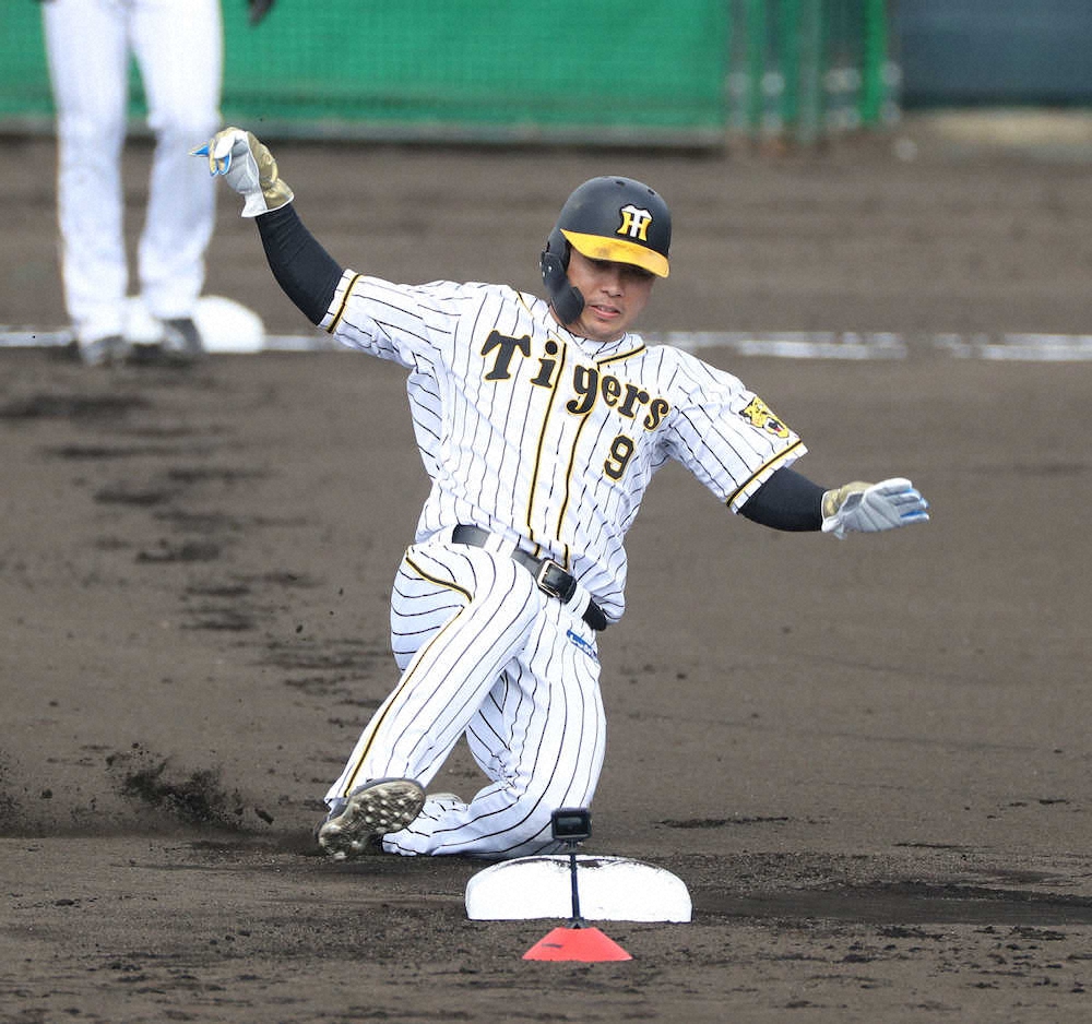 <阪神キャンプ> 走塁練習で二塁に滑り込む高山(撮影・大森 寛明)