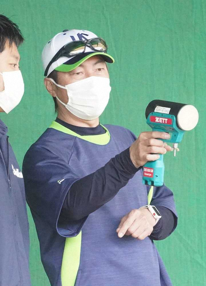 ブルペンでスピードガンを手にする高津監督(撮影・村上 大輔)