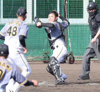<阪神宜野座キャンプ> 紅白戦 6回 1死二塁 飛び出した二走・原口を二塁へ送球し刺す栄枝(中央) Photo by スポニチ 「2軍に行かすぞ」 阪神ドラ4栄枝 矢野監督の言葉に“発奮” 12球団新人… ギャラリーで見る この記事のフォト 2021年02月05日の画像一覧 もっと見る 2021年02月05日の画像をもっと見る