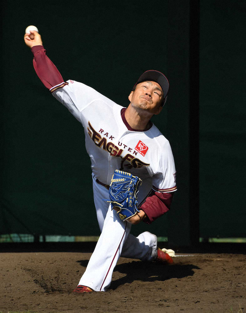 楽天の則本昂がワインドアップでブルペン投球を行った。昨季は無走者時もセットポジションで投げたが、再変更を模索。「体に出力を覚えさせるために投げてみた。今日はしっくりこなかった」と話した。