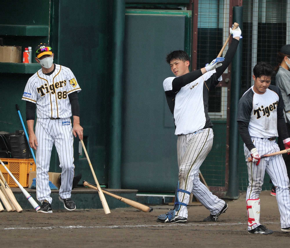 阪神・矢野監督が期待の大砲・井上に打撃指導した。フリー打撃をケージ後ろからチェックしていたが、井上が隣に移るのに合わせて平行移動。結局、3カ所すべての計108スイングを見守った。