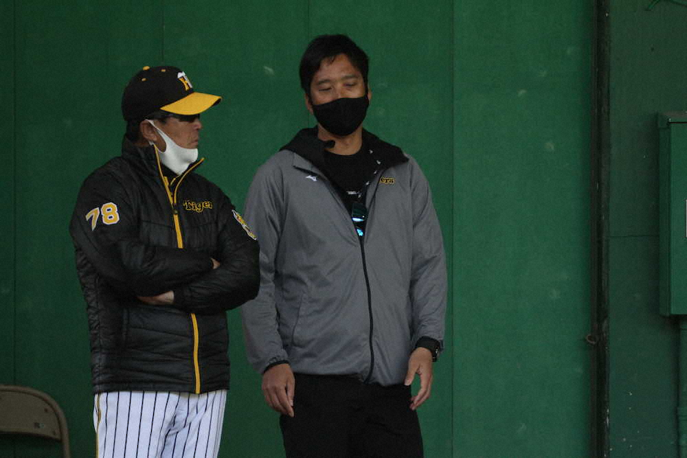 <阪神2軍キャンプ>ブルペンで会話する平田2軍監督と藤川SA