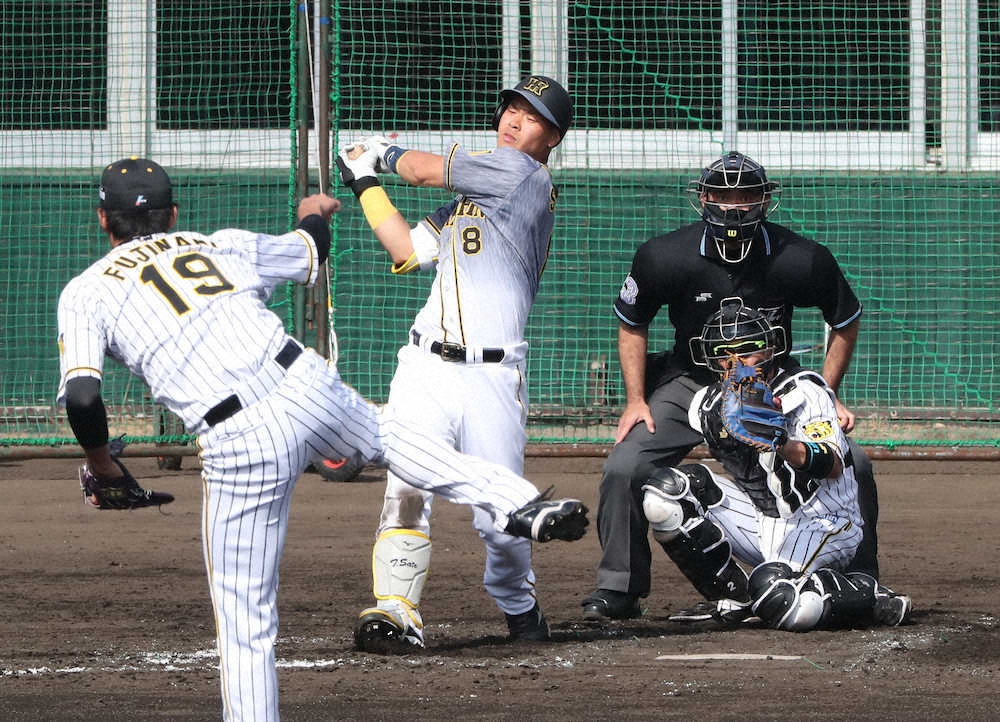 阪神のドラフト1位・佐藤輝(近大)が7日の紅白戦で初対戦し、4球オール直球で空振り三振に倒れた藤浪との対戦を振り返った。初球148キロ速球に豪快な空振りを見せると1球ボールの後は150キロ速球を見逃し。最後はこの日の藤浪の最速となる155キロにバットが空を切った。