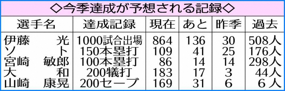 18年41本、19年43本で2年連続本塁打王に輝いたDeNA・ソトは通算150本塁打にあと41本。昨年まで362試合に出場しており、500試合未満で達成すれば14年バレンティン(ヤ=463試合)以来。チームでは77年シピンの626試合を抜く最速記録になる。
