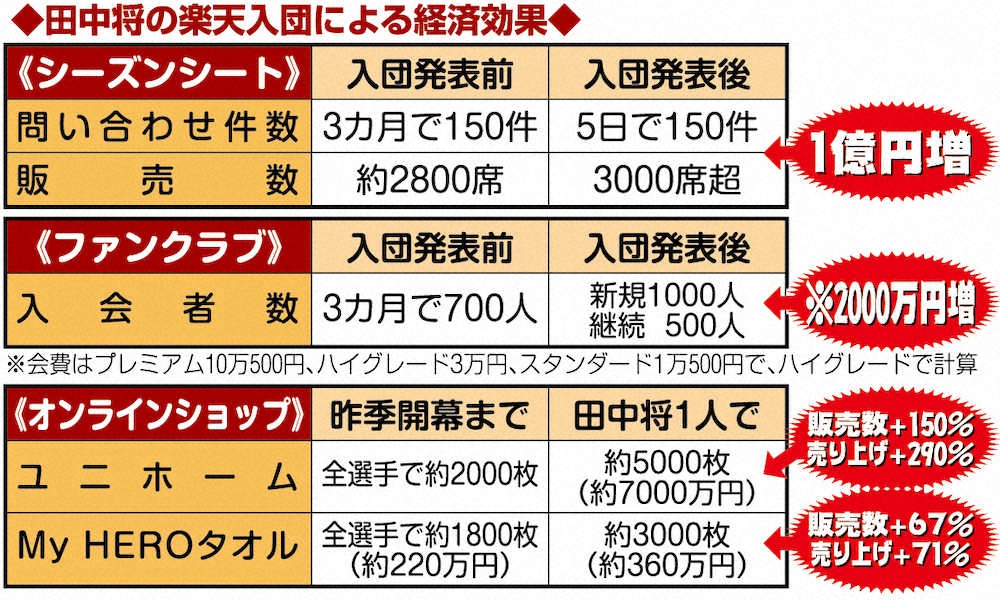楽天の田中将。復帰以来、球団は営業面で驚異の収入増となっている Photo by スポニチ 楽天、マー君特需だ2億円超!復帰決定から驚異の収入アップ 年間シート売… ギャラリーで見る この記事のフォト 2021年02月11日の画像一覧 もっと見る 2021年02月11日の画像をもっと見る