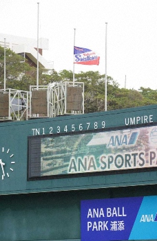 ヤクルトのキャンプ地・浦添市民球場では、元監督の野村克也さん(享年84)の一周忌を迎えた11日、スコアボード上に半旗が掲げられた。