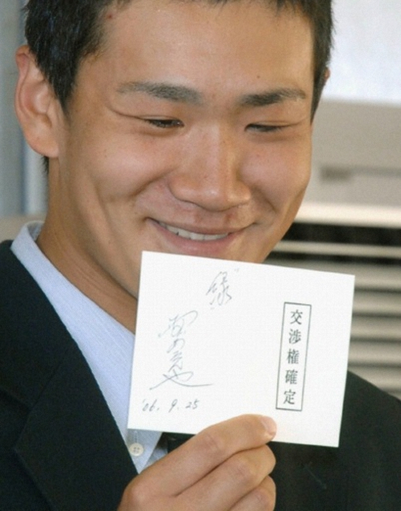 06年ドラフト会議時の「交渉権確定」のカード。野村さんが「縁」と書き込み、田中将に贈られた。「プロに入って野村監督でよかったと思っているし、それはこれから先も変わらないと思う」は20歳当時の言葉。30歳を超えた右腕は、亡き恩師との出会いを「僕の野球人生における最大の幸運の一つ」と言った。(スポーツ部デスク)