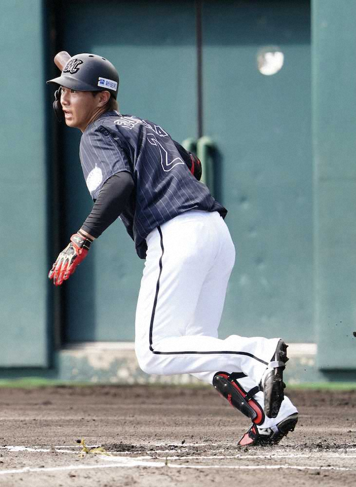 <練習試合 楽・ロ>初回、中前打を放つ藤原(撮影・長久保 豊)