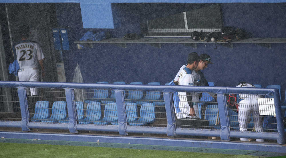 日本ハムの紅白戦が雨天中止でベンチを引き上げる選手達(撮影・高橋 茂夫)