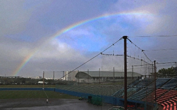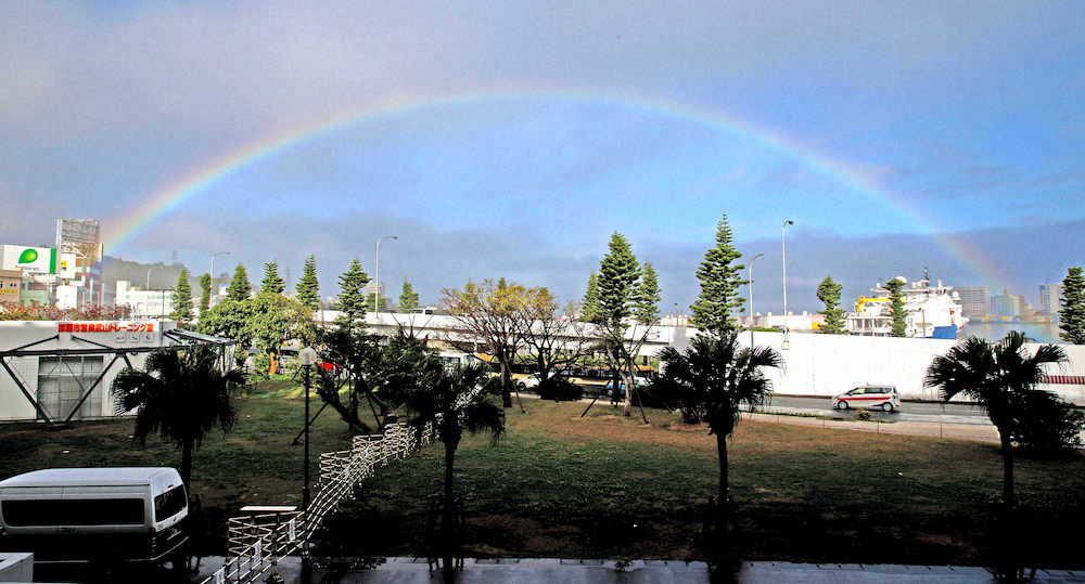 <巨人沖縄キャンプ>セルラースタジアムの外には綺麗な虹が(撮影・森沢裕)=14日、那覇市