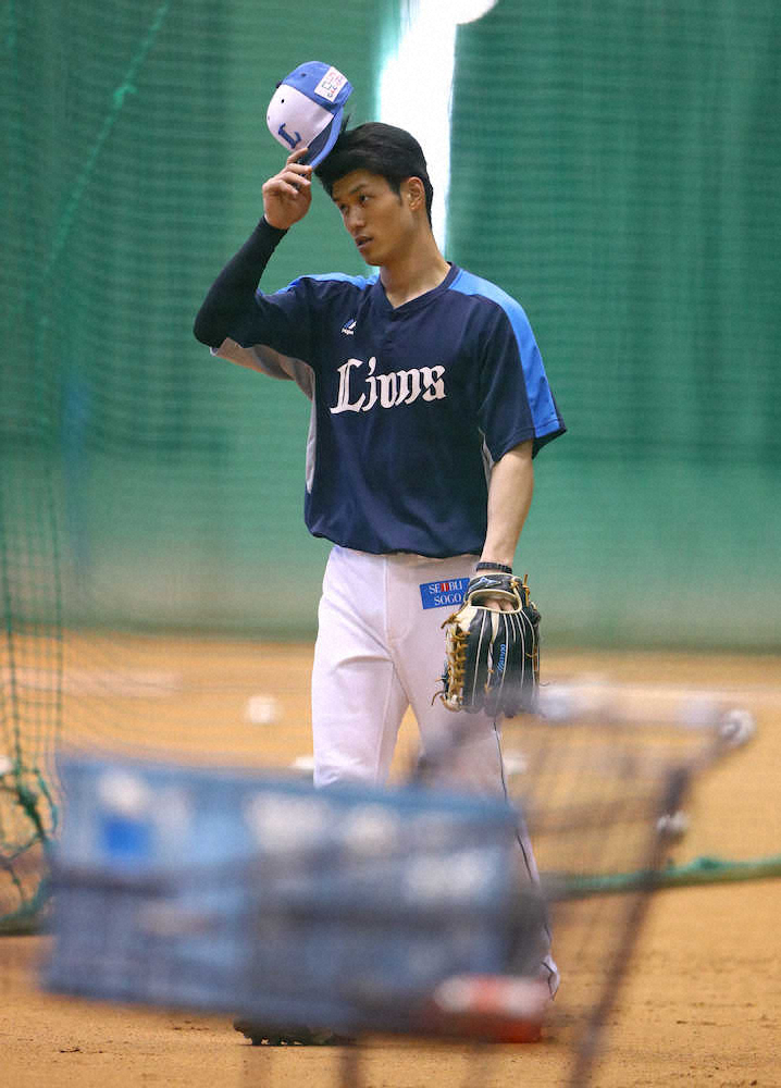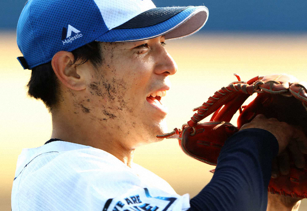 <西武キャンプ>顔を泥だらけにして特守する山野辺(撮影・尾崎 有希)=15日、宮崎・南郷