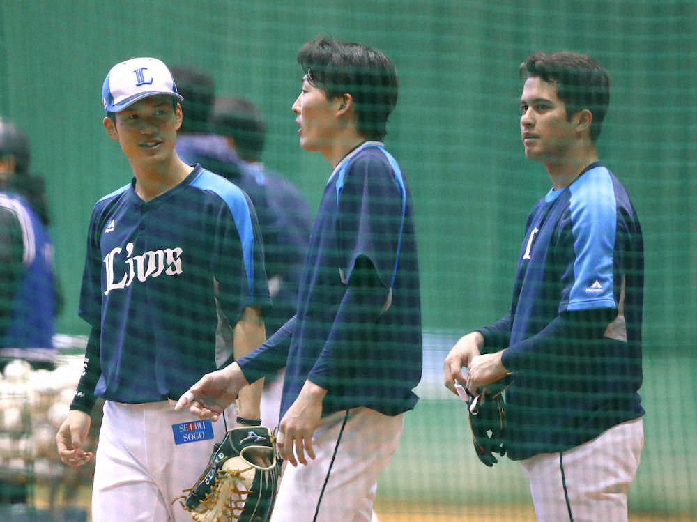 <西武キャンプ>源田(中央)の話を聞く若林(左)とブランドン(撮影・尾崎 有希)=15日、宮崎・南郷
