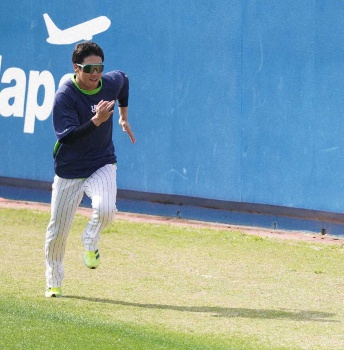 <ヤクルトキャンプ>ポール間をダッシュする山田(撮影・村上 大輔)=15日、沖縄・浦添